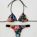 Bikini triangulito, less, floreada con detalle de frunce en lateral de bombacha y tasas removibles.